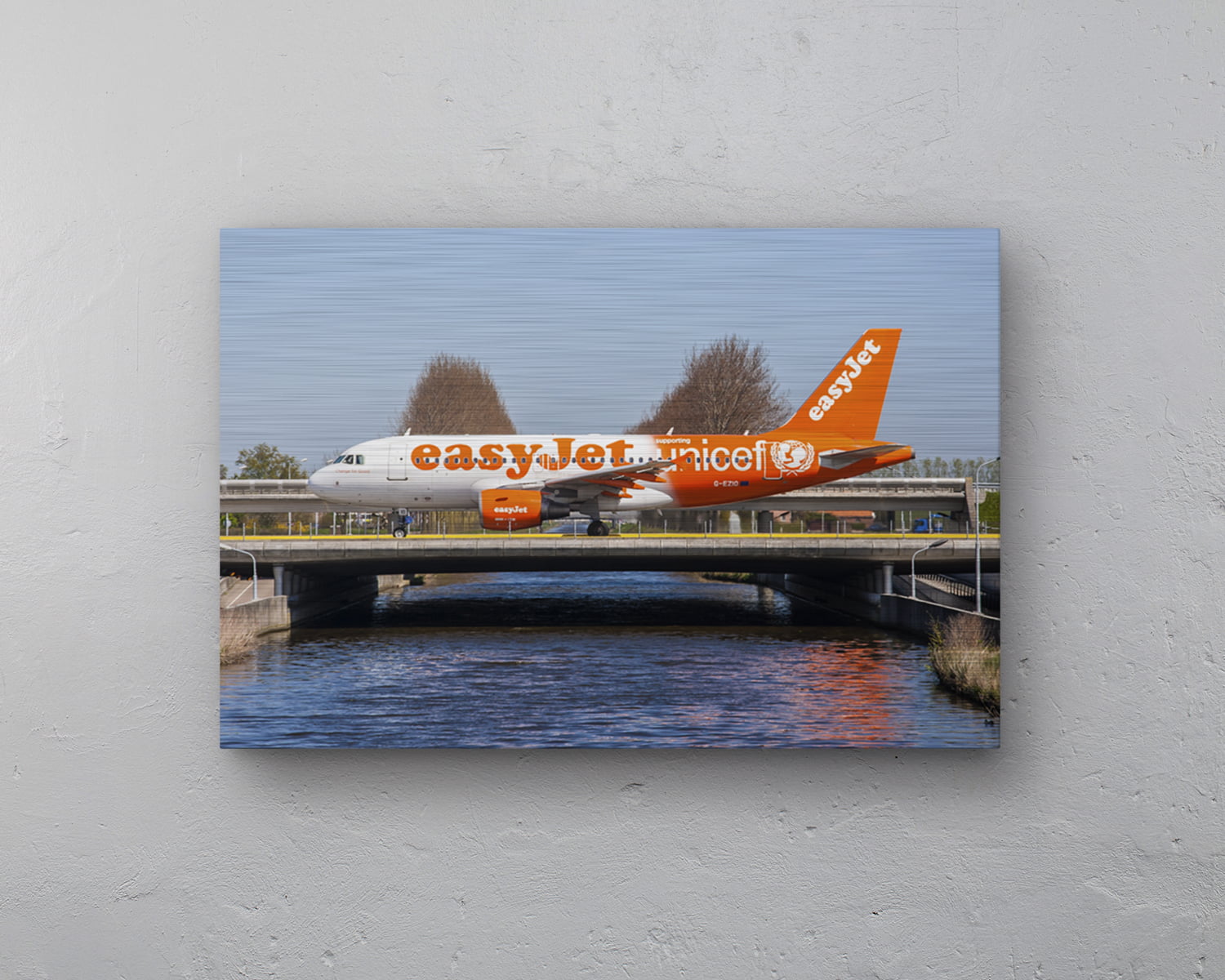 Easyjet Airbus A319 Unicef Livery Registration: G-EZIO Size: 60 cm x 40 cm High quality printed on 3mm dibond aluminum including mounting plates. Perfect as a gift for the real aviation enthusiast! Free shipping and delivered within one week!