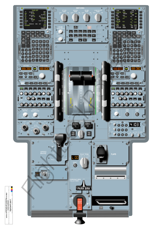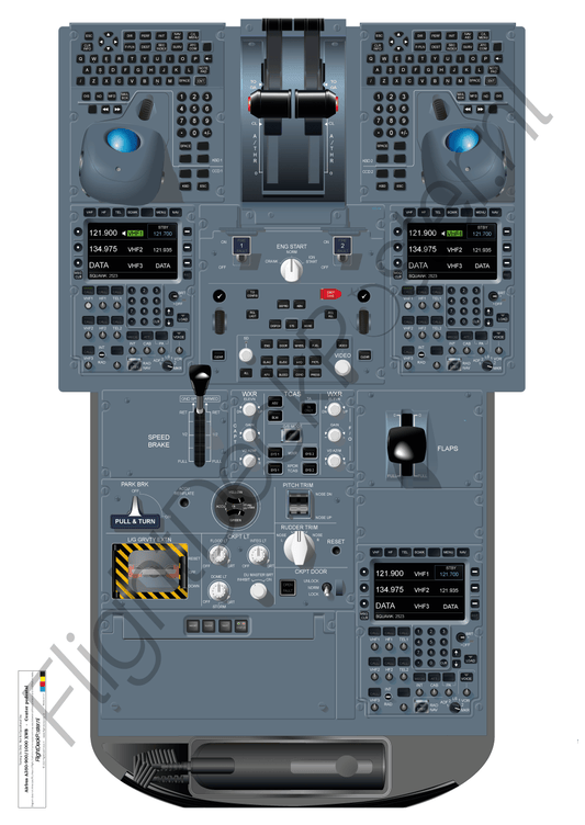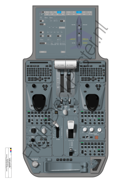 - Triple-A – Bij deze poster ontvangt u het instrument panel, de overhead panel en de center pedestal respectievelijk gedrukt op een A0 en A1 posters. Bij het instrument panel wordt de volledige breedte van het A0 formaat benut, maar wordt loze ruimte boven en onder weggesneden.